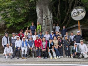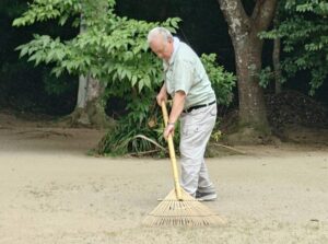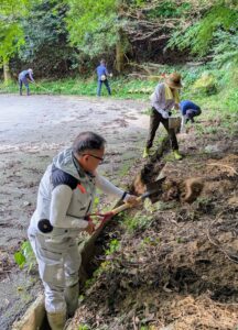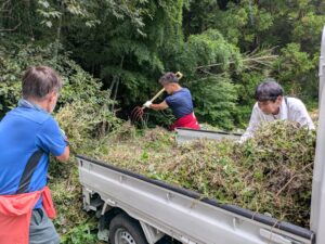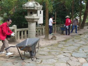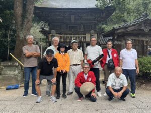 雷山千如寺様では、参道や駐車場の周辺に生えた草を草刈り機などで刈り取ったり、溝に流れ込んだ土砂を取り除いたりしました。また、空気をノズルから噴き出すブロワーで落ち葉を集めたりもしました。櫻井神社様では、参道などで秋の兆しとともに増えてきた落ち葉を丁寧にかき集めました。残暑が続く中の活動で、作業を終えると、メンバーたちは汗びっしょりになっていました。