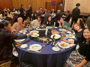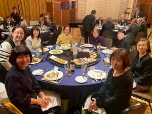 令和7年12月9日,東洋と西洋の融合した雰囲気の豪華なホテル、グランドハイアット福岡様に於いて、第1353回のクリスマス特別同伴例会が行われました。恒例の例会報告を終え、L吉塚の乾杯のご挨拶のもと、クリスマス懇親会が始まりました。フレンチ風の厳選された食材のビユッフェスタイルで、多様な料理を楽しみながら、会員、LLの方も交流されてました。