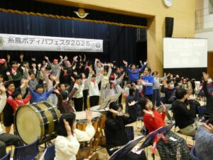 糸島特別支援学校様の児童・生徒と、地元の子どもたちが手や体を叩いて音を出し、リズムを奏でる「ボディパーカッション」を通して交流を深めるフェスタが12月13日、糸島市泊の同校体育館で開かれました。障がいの有無を問わず分け隔てなく受け入れるインクルーシブ(包み込むような)なまちづくりのモデルを生み出していこうと、糸島ライオンズクラブが主催し、子どもたちは糸島フィルハーモニー管弦楽団様の演奏に合わせ、元気いっぱいに手拍子を打ったり、足踏みをしたりしました。