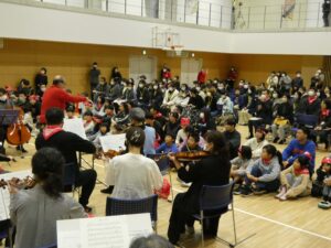 フェスタは、山田様が進行役となって開演。モーツァルトの「アイネ・クライネ・ナハトムジーク」やチャイコフスキーの組曲「くるみ割り人形」の「トレパーク」といった軽快な曲に合わせ、子どもたちは夢中になってリズムを刻んでいました。また、即興の手拍子演奏もあり、観客席の保護者や関係者も加わり、計200人が一体となって手を打ち鳴らしました。