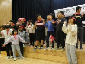 ボディパーカッションは、九州栄養福祉大学教授で、同振興会代表の山田俊之様が発案。体全体を打楽器(パーカッション)にして、身体のあちこちを手で打ち鳴らすことで音を楽しみます。参加したのは特別支援学校様の小学部5年生~中学部2年生の児童・生徒18人と、地元の行政区様などの児童生徒17人で、九州大学様の学生ボランティアも加わりました。開会行事で、糸島LCの梅田倉則会長が「子どもたちは一生懸命、練習してきました。成長した姿を見ていただけたらと思います」とあいさつしました。