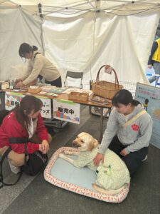 九州盲導犬協会様の活動紹介では、盲導犬になるための訓練を受けている2頭が参加しました。訪れた人たちは盲導犬の頭をなでるなどしながら、同協会職員から盲導犬の果たす役割などについて聞いていました。また、同協会様のグッズ販売も行われました。同協会歩行指導員の伊藤優子様は「普及の大切さを多くの人に感じ取っていただいたと思います」と話していました。